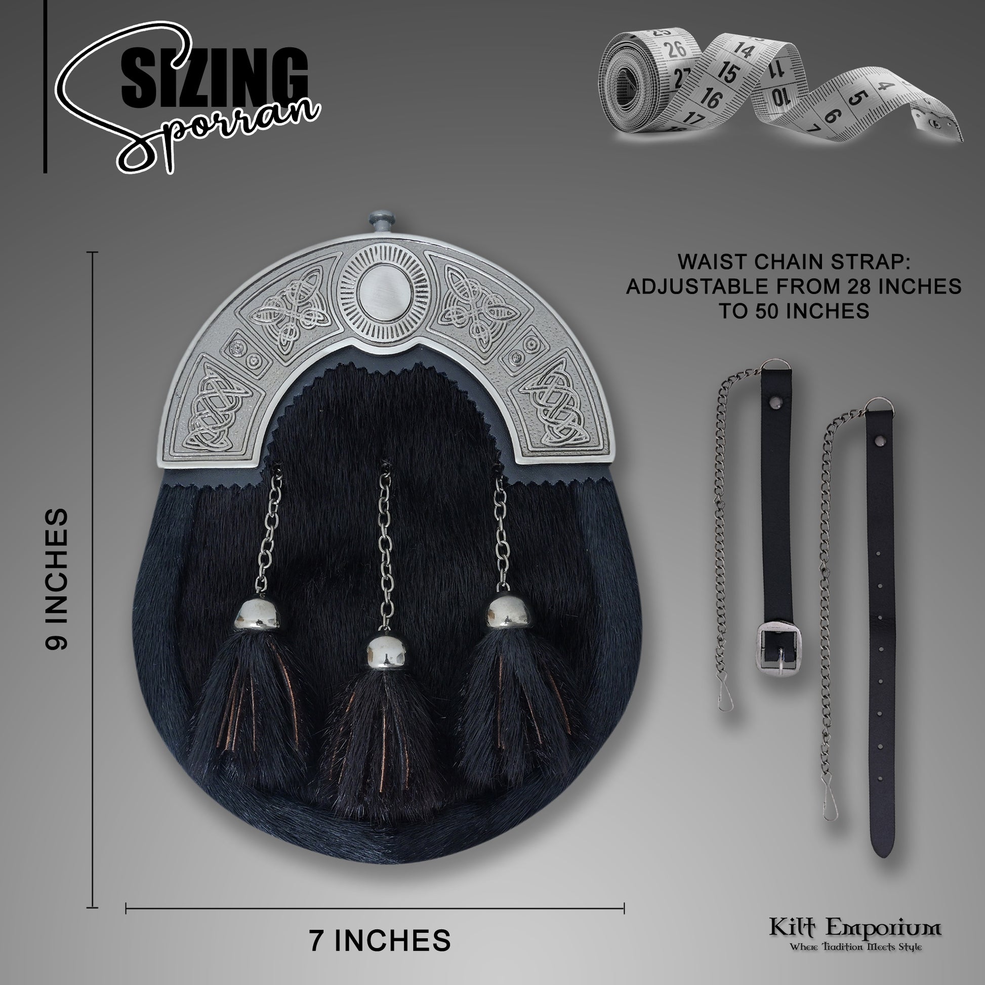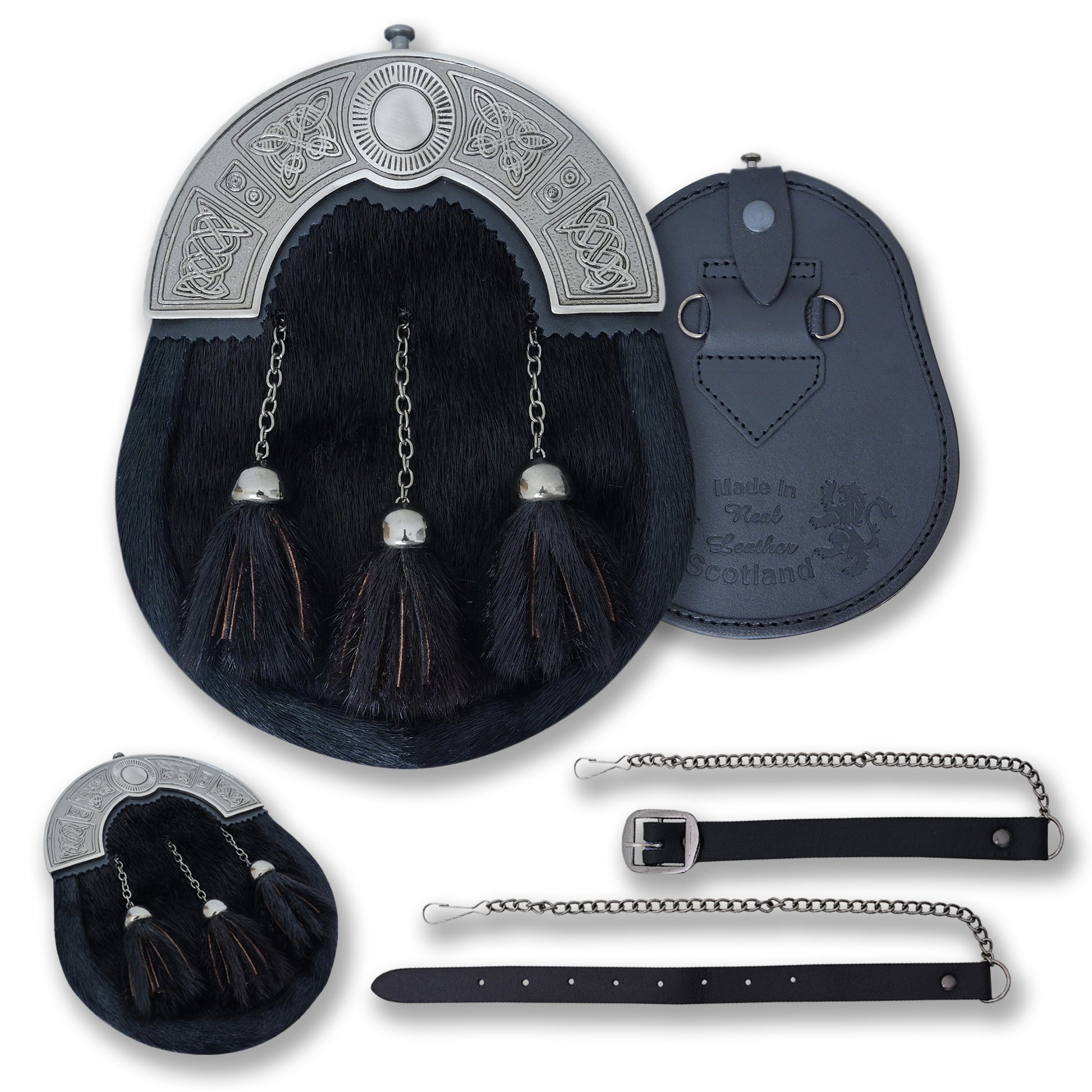 Complete your Highland look with the Celtic Knot Cantle Black Sporran, a refined and traditional men’s kilt accessory. Designed with a striking Celtic knot cantle and crafted from premium genuine leather, this full-dress sporran brings both elegance and function to any Scottish outfit.