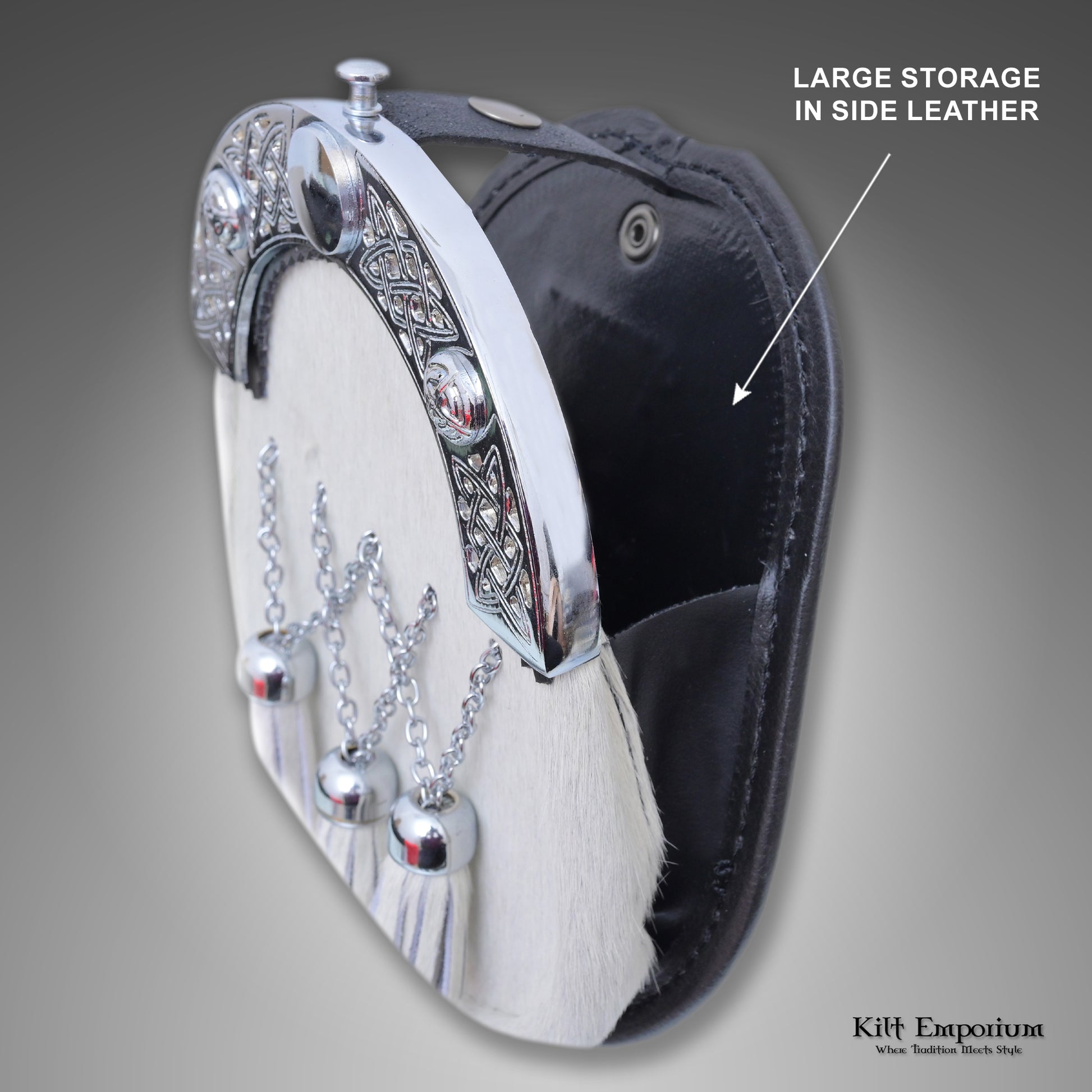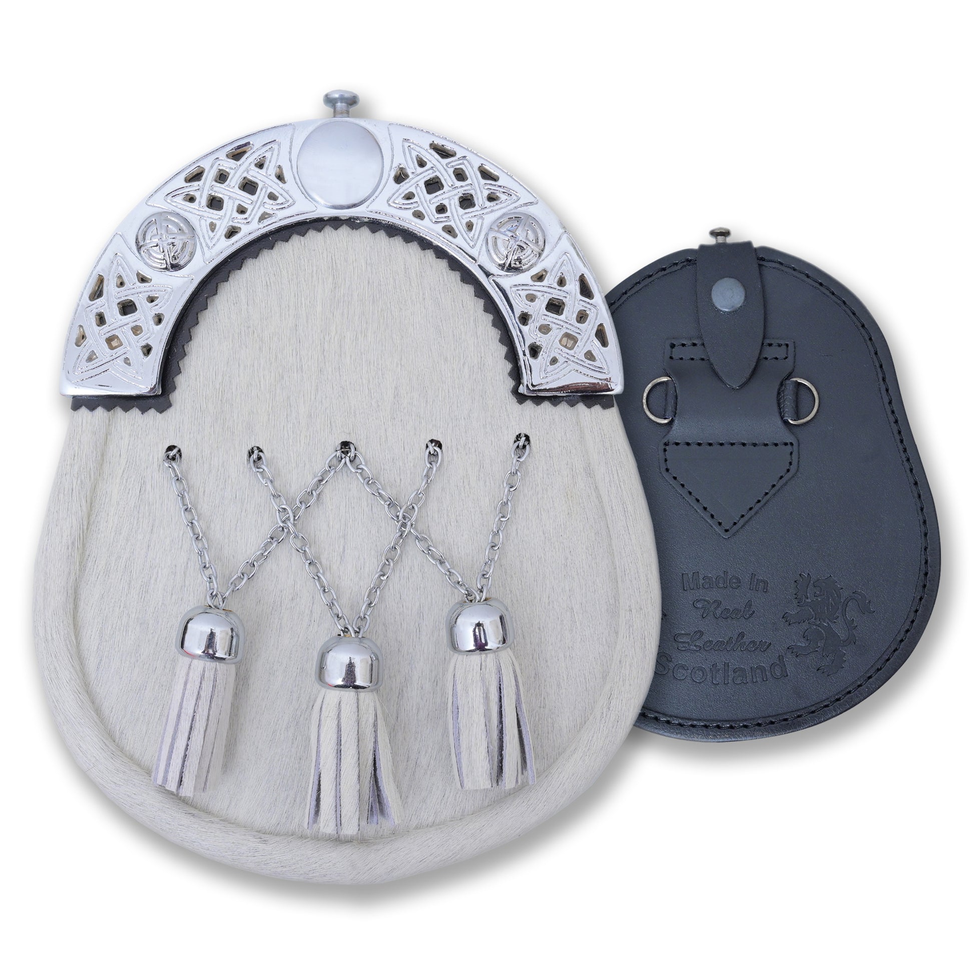 Premium Celtic Knot Cantle Sporran – White Cross Tassels, Genuine Leather